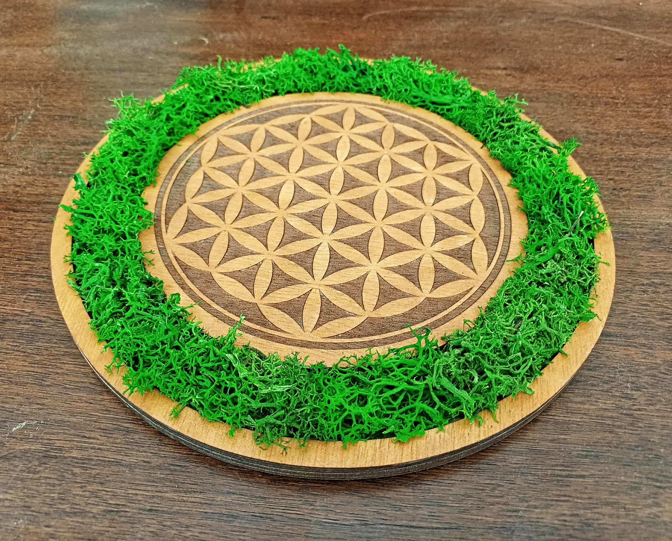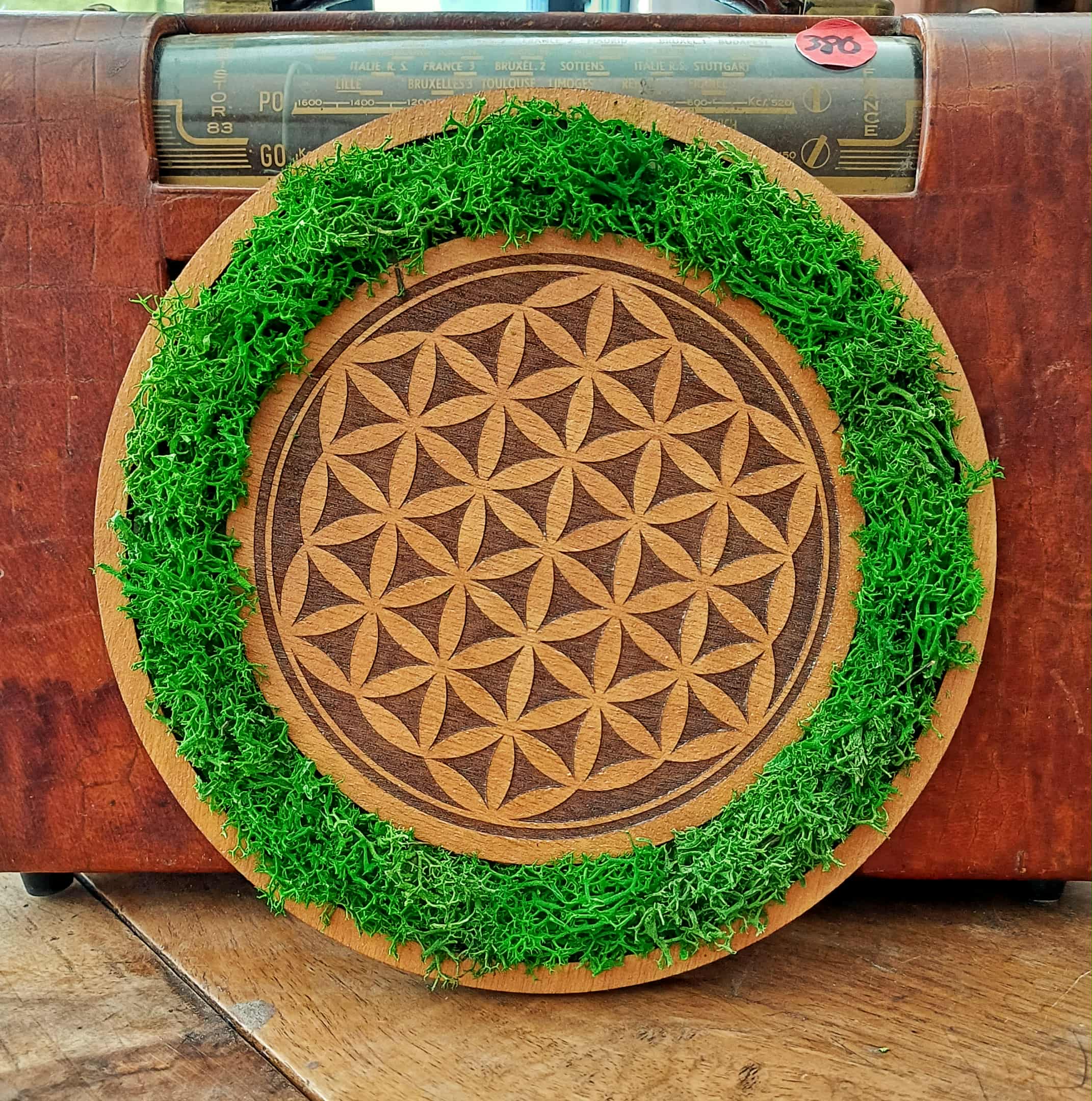 Décoration murale de 20 cm de diamètre en bois avec le dessin de la fleur de vie en négatif.