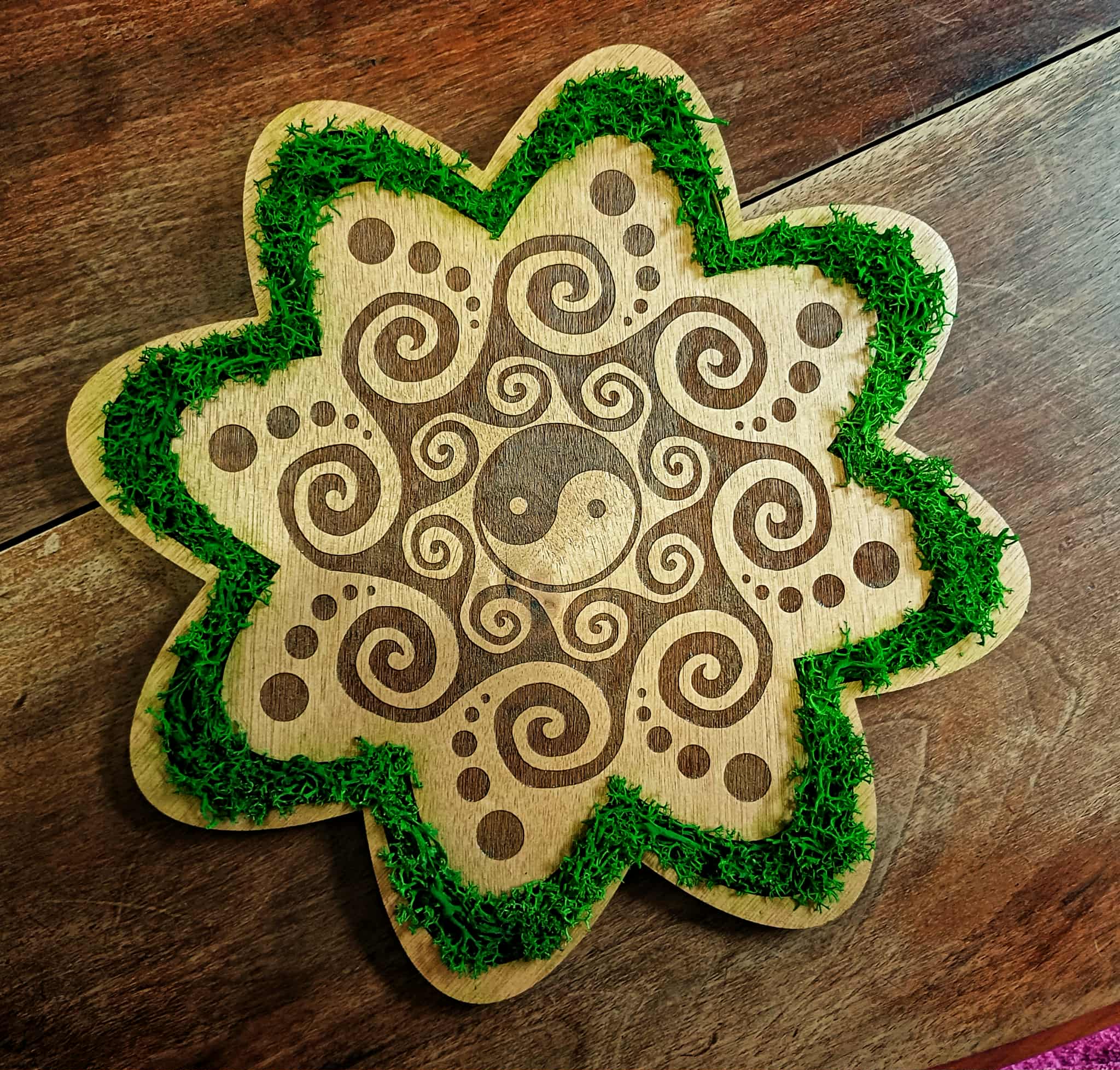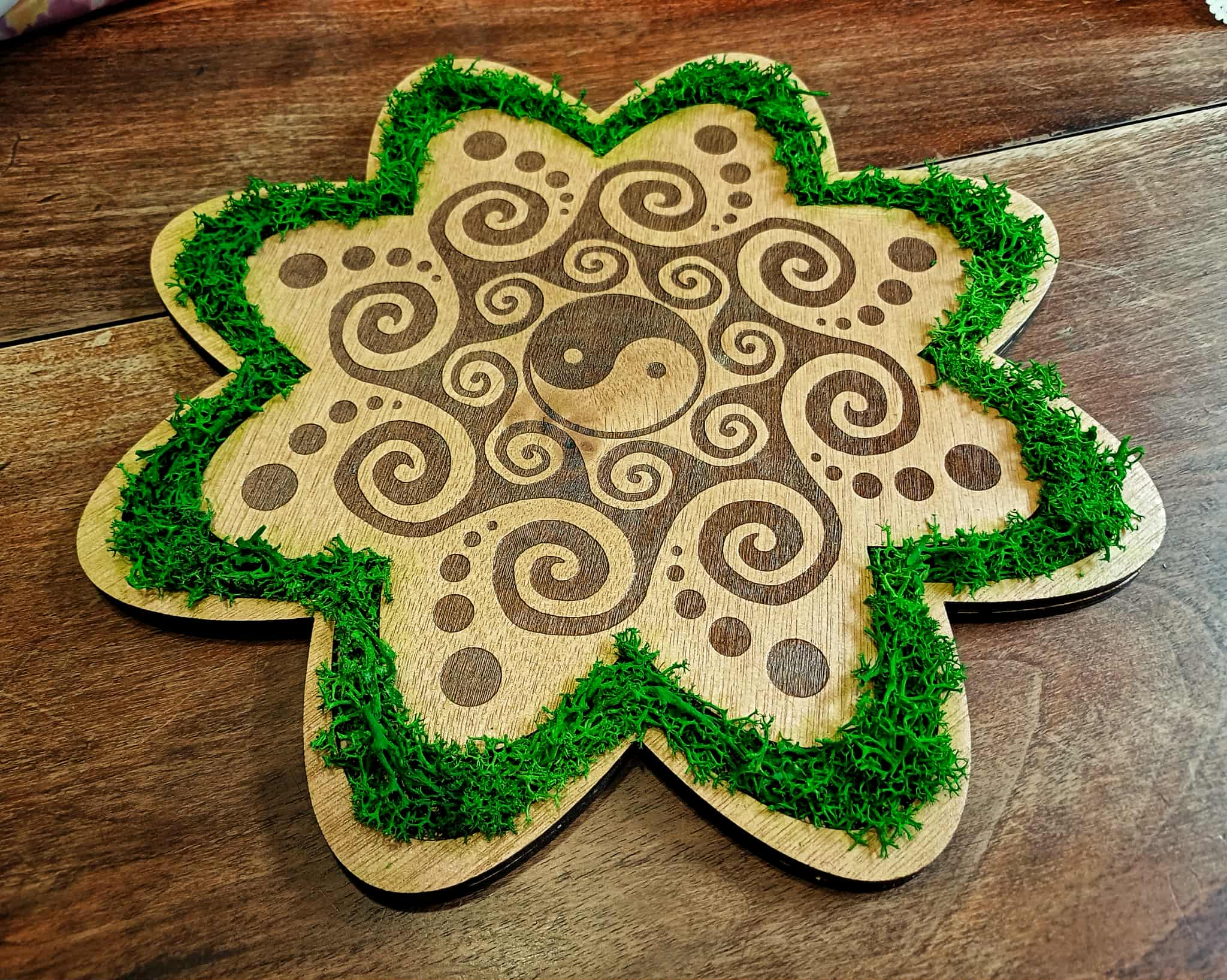 Décoration murale de 25 cm de diamètre en bois avec le dessin du Yin et yang dans une fleur.