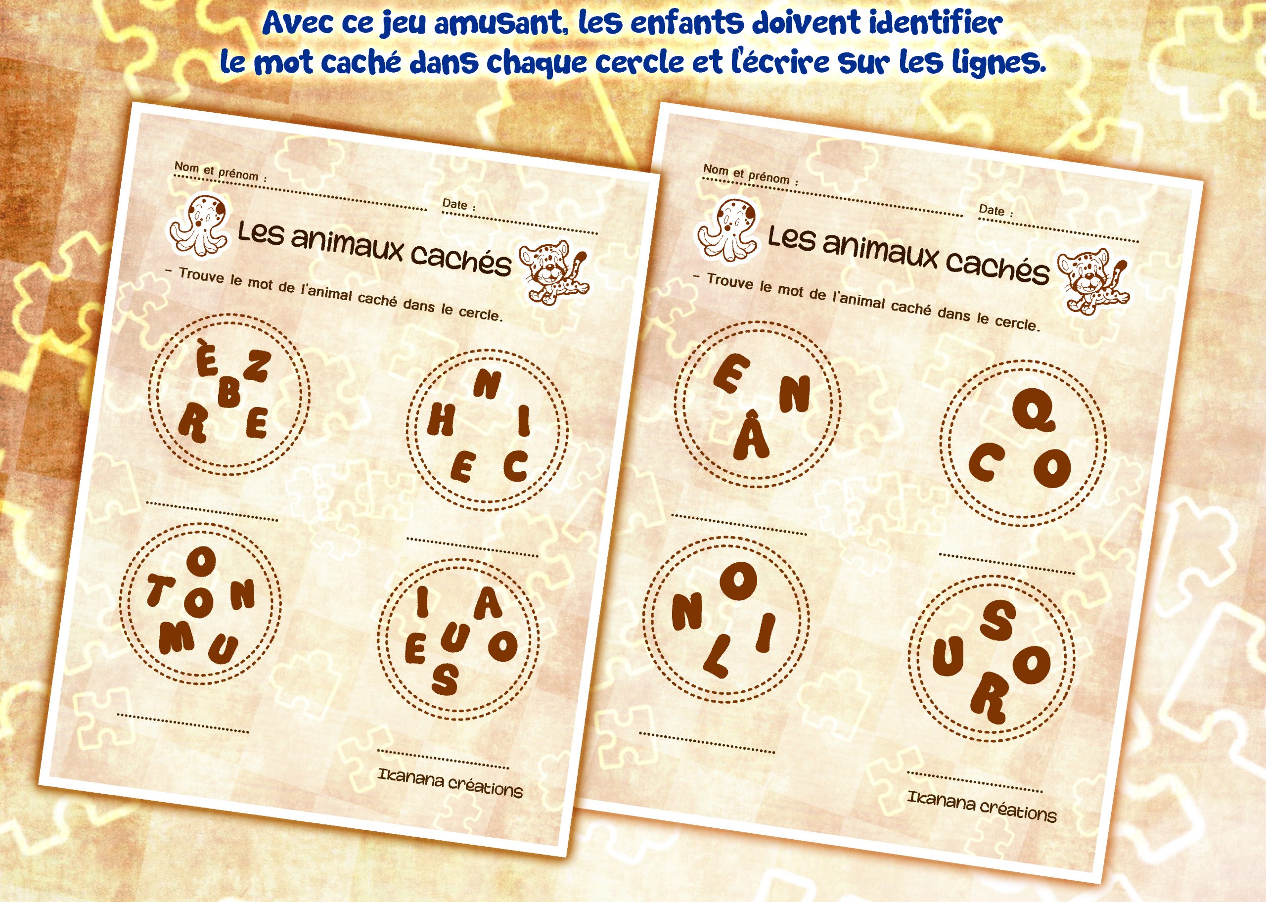 L’enfant doit trouver le mot de l’animal qui est caché dans chaque cercle et l’écrire sur chaque ligne.