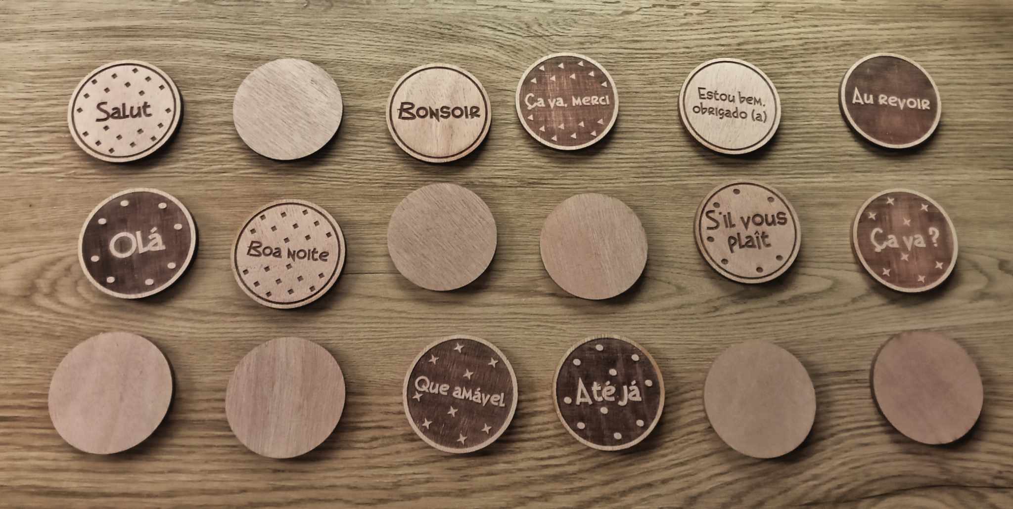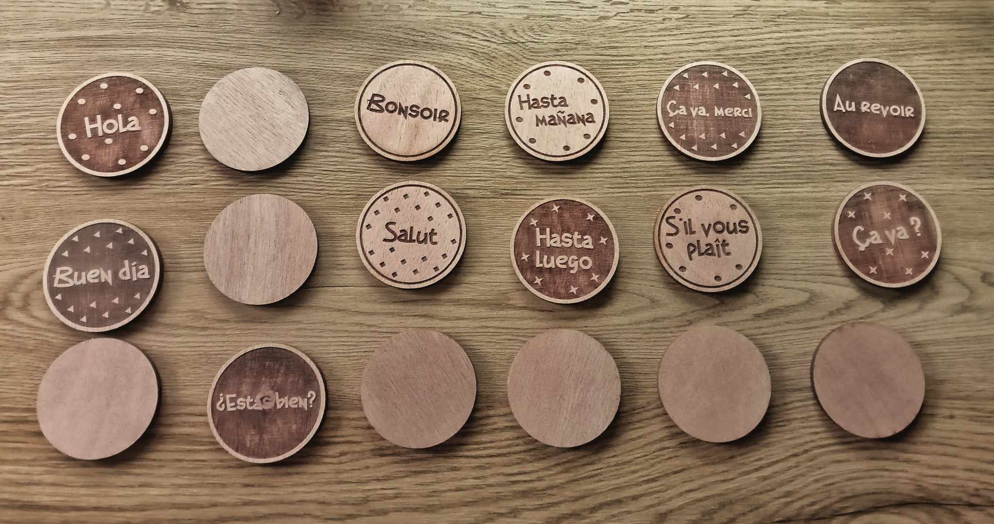 Un jeu de mémoire original en bois dont vous pouvez apprendre des phrases basiques en autres langues et au même temps, défier à votre rival à gagner le plus de jetons dans le jeu.