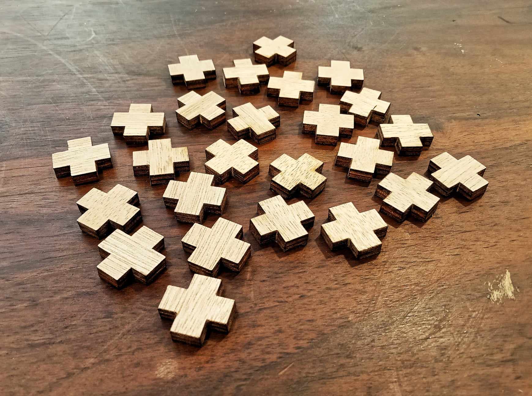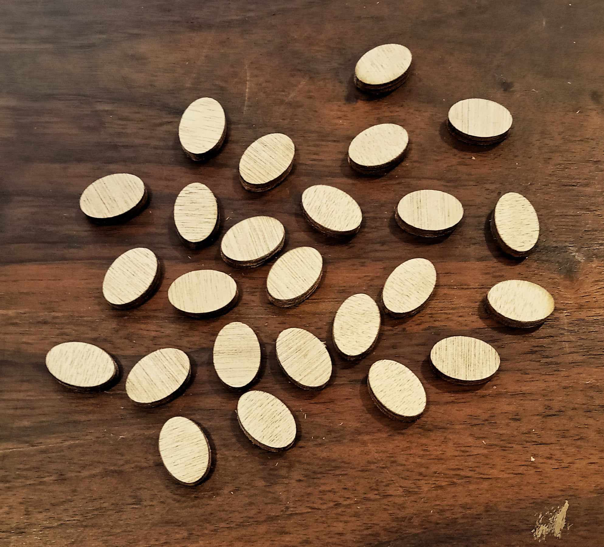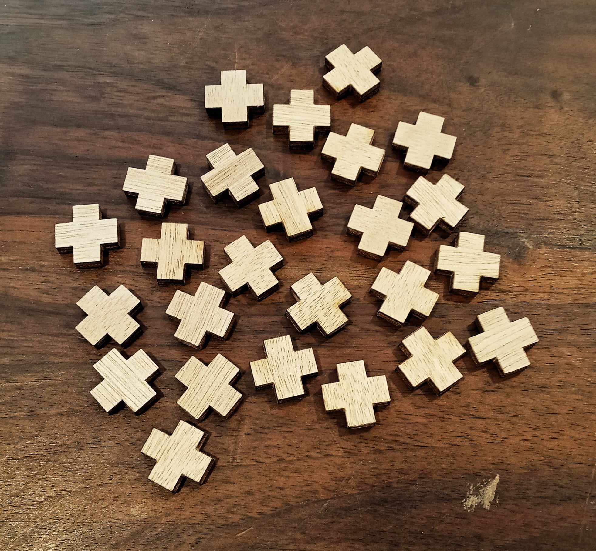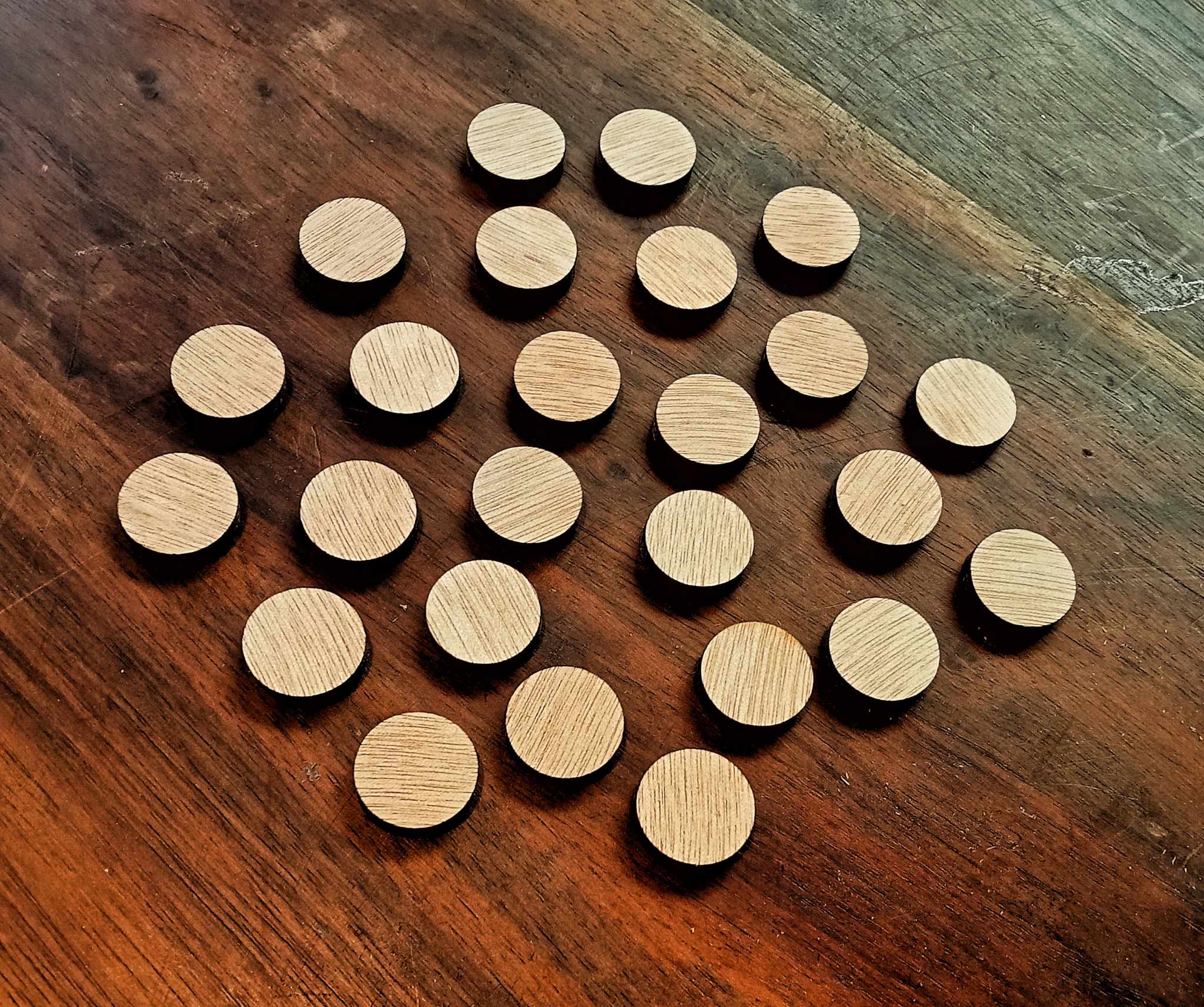 Lot de 25 pions en bois de 2 centimètres de diamètre avec des formes simples à choisir.