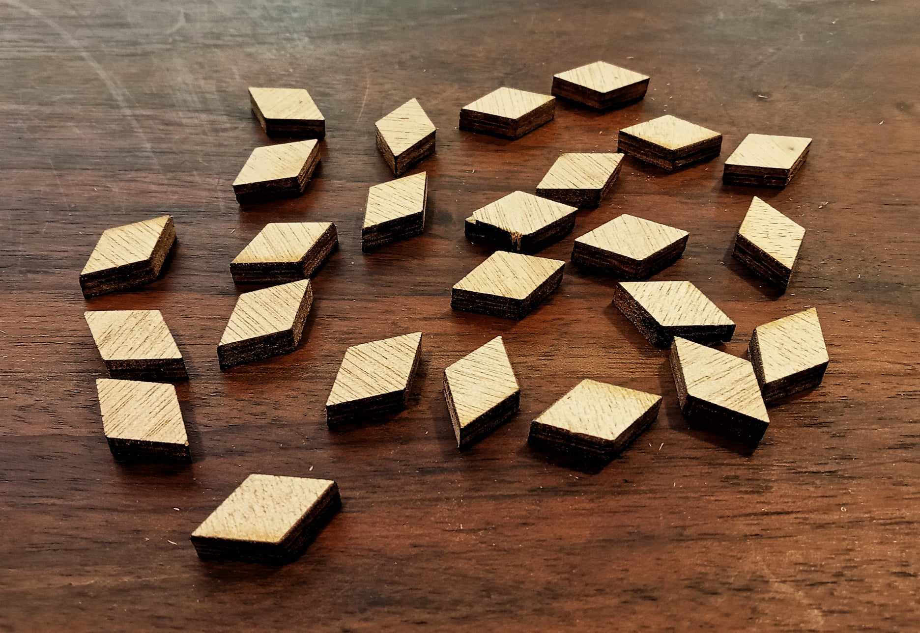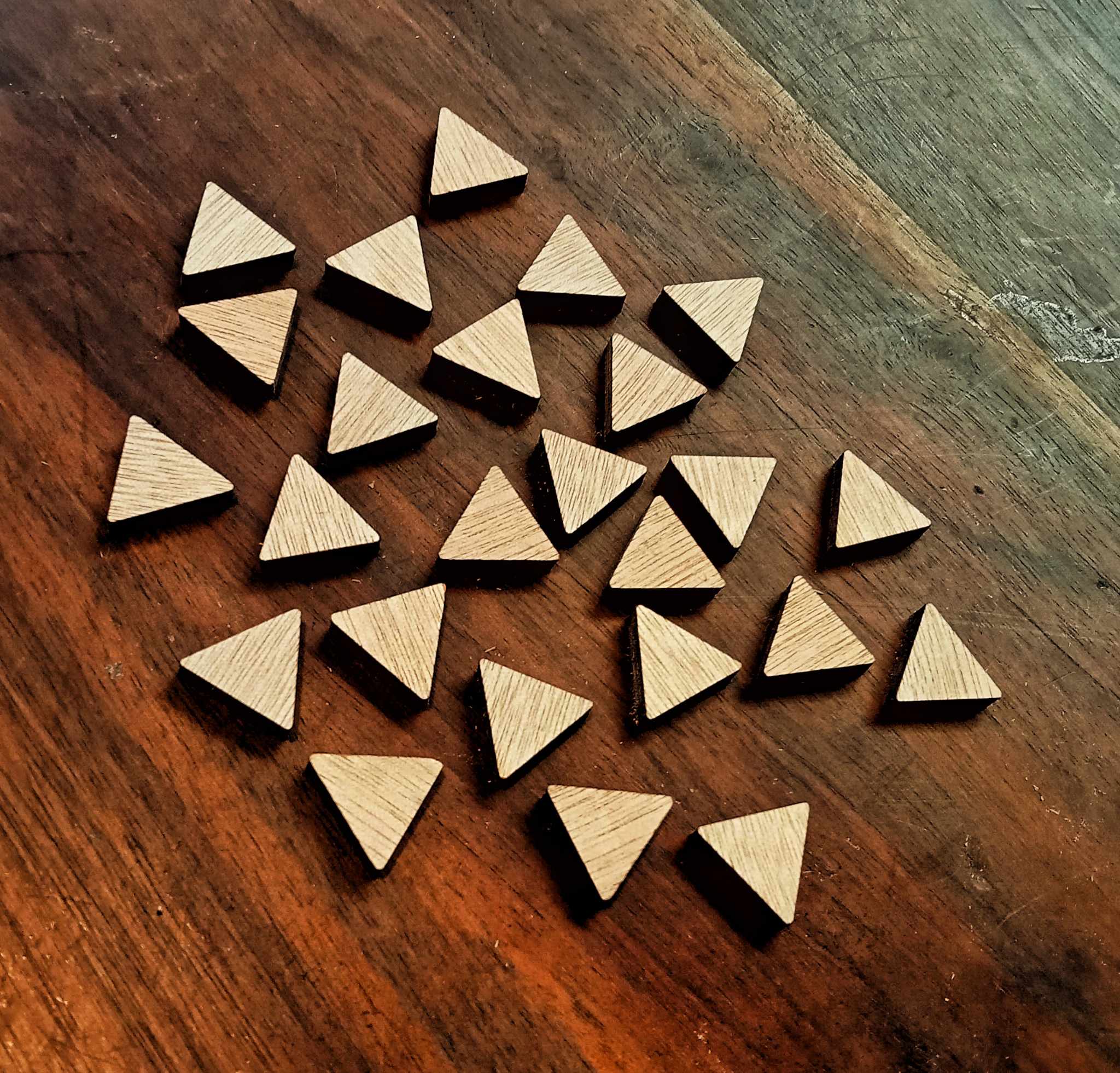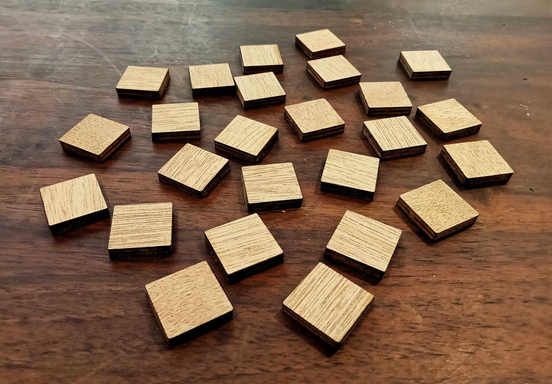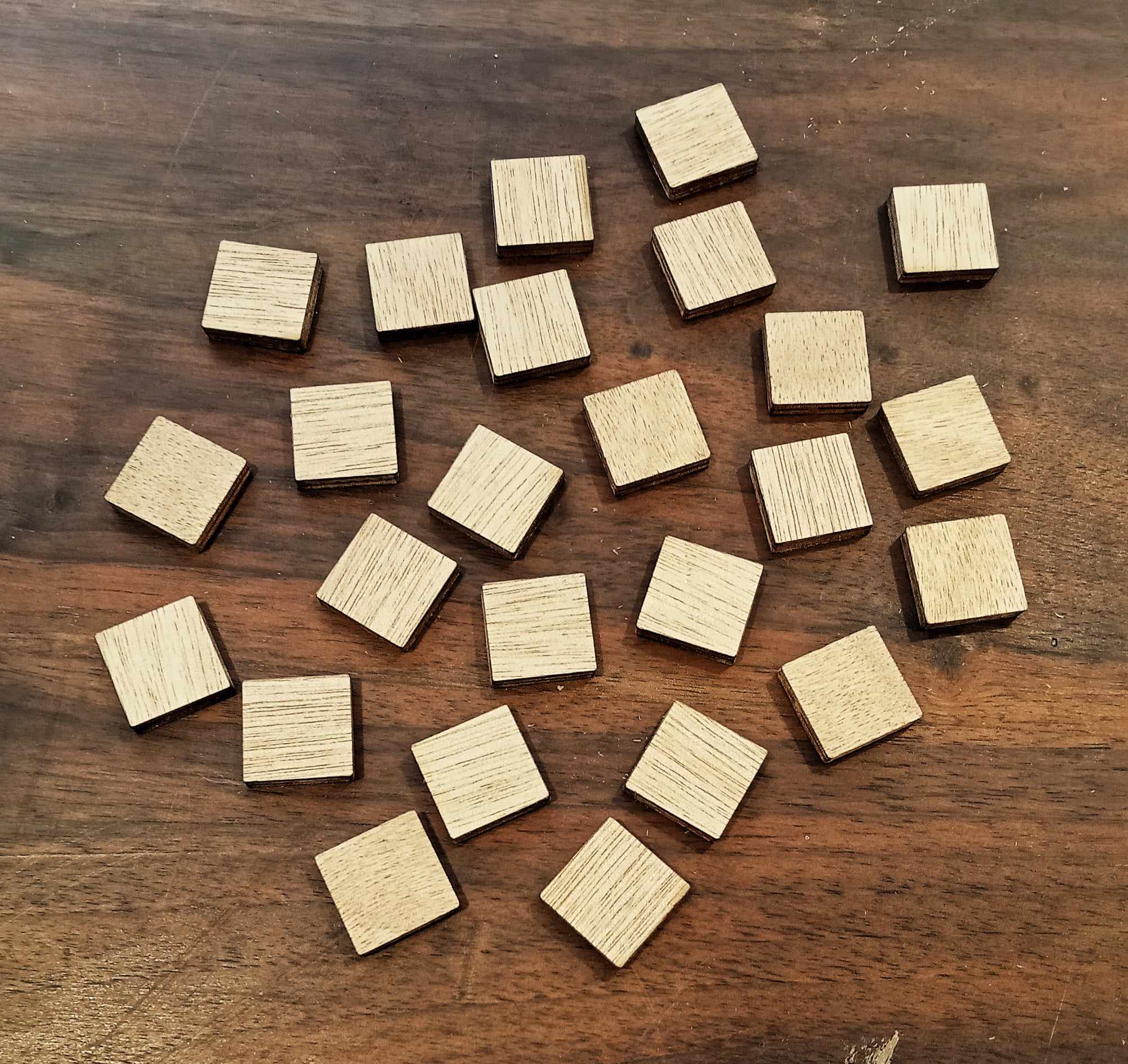 Lot de 25 pions en bois de 2 centimètres de diamètre avec des formes simples à choisir.