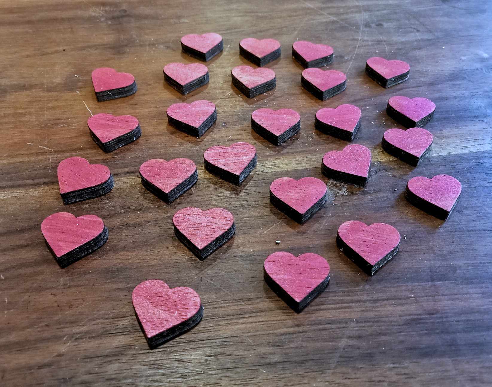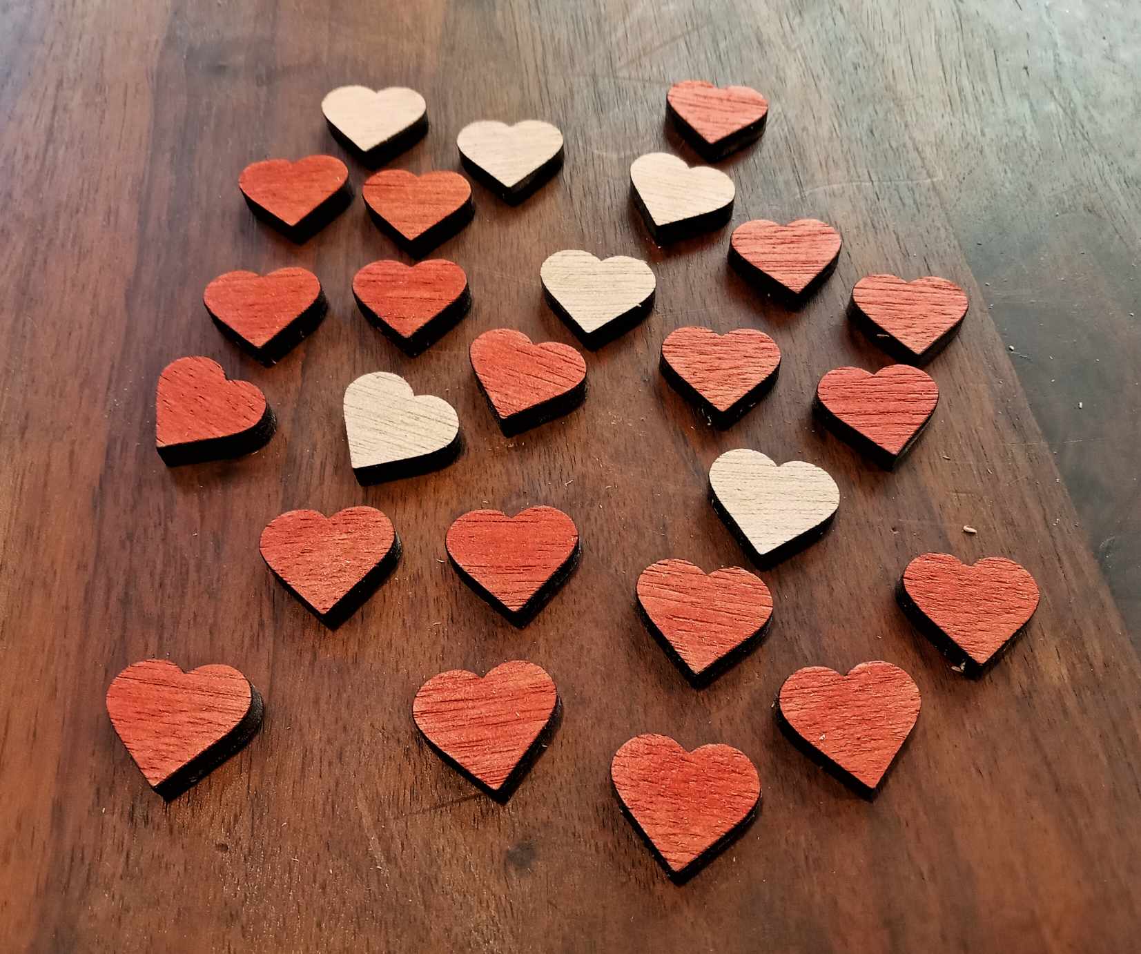 Lot de 25 pions en bois colorés de 2 centimètres de diamètre avec la forme de cœur à choisir.