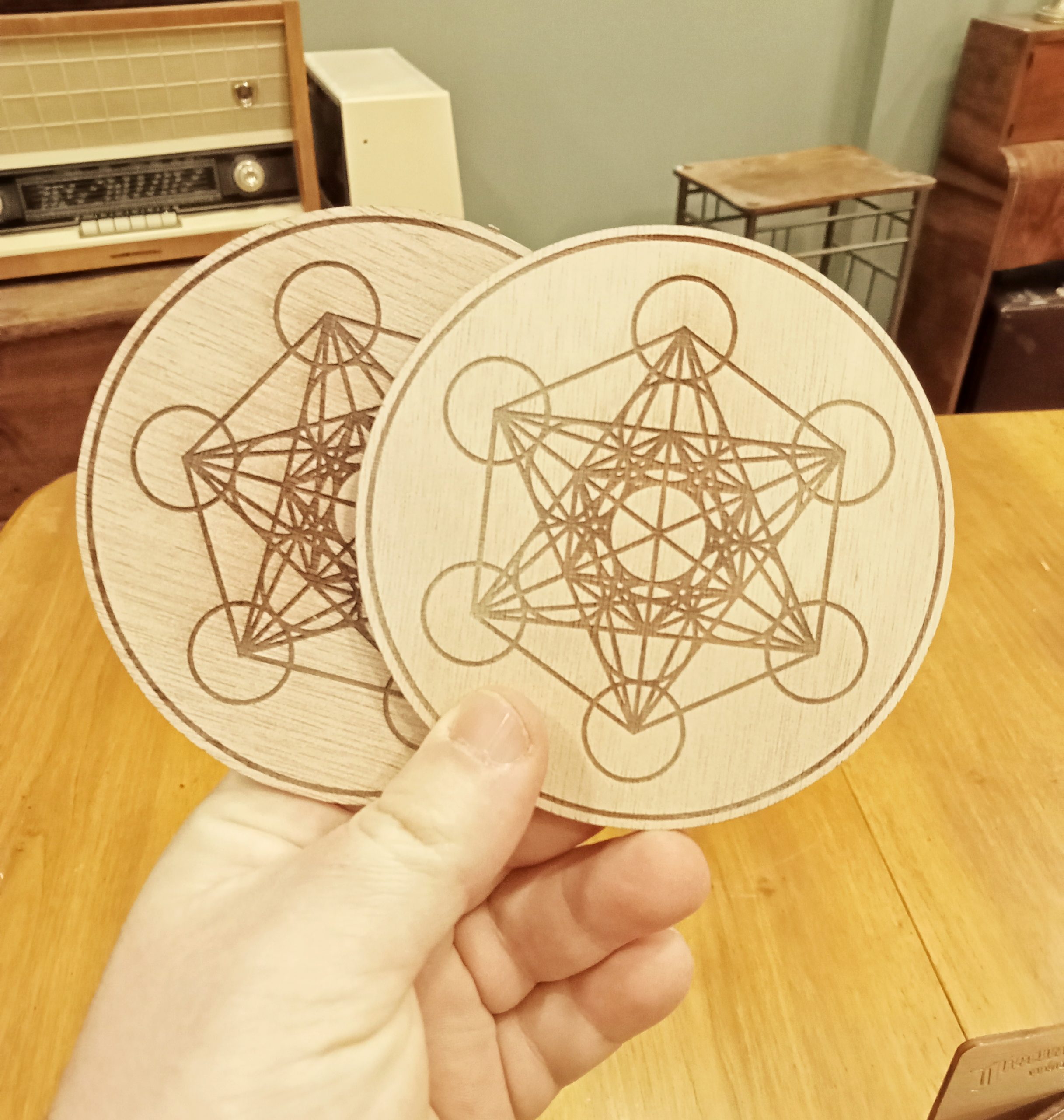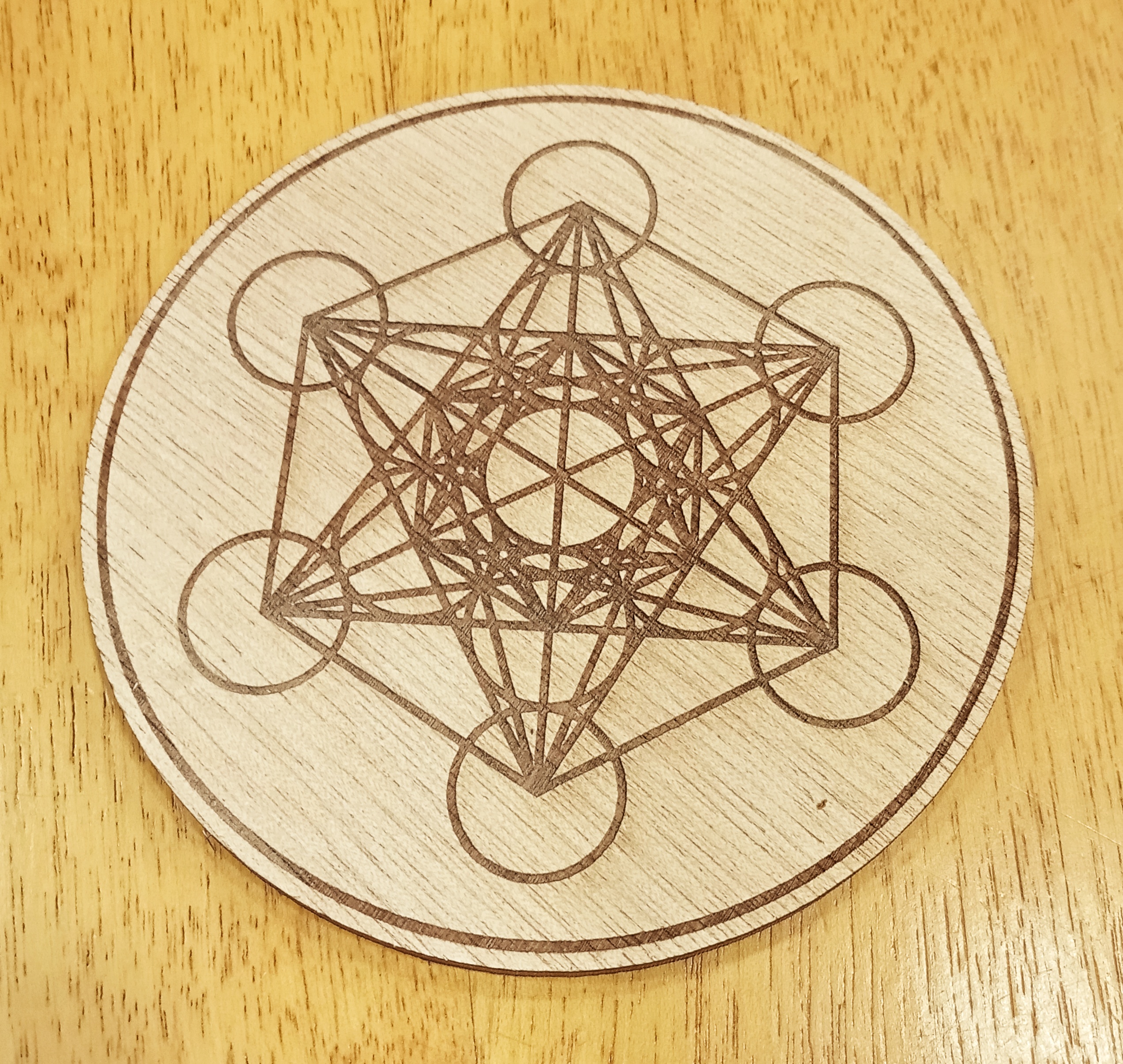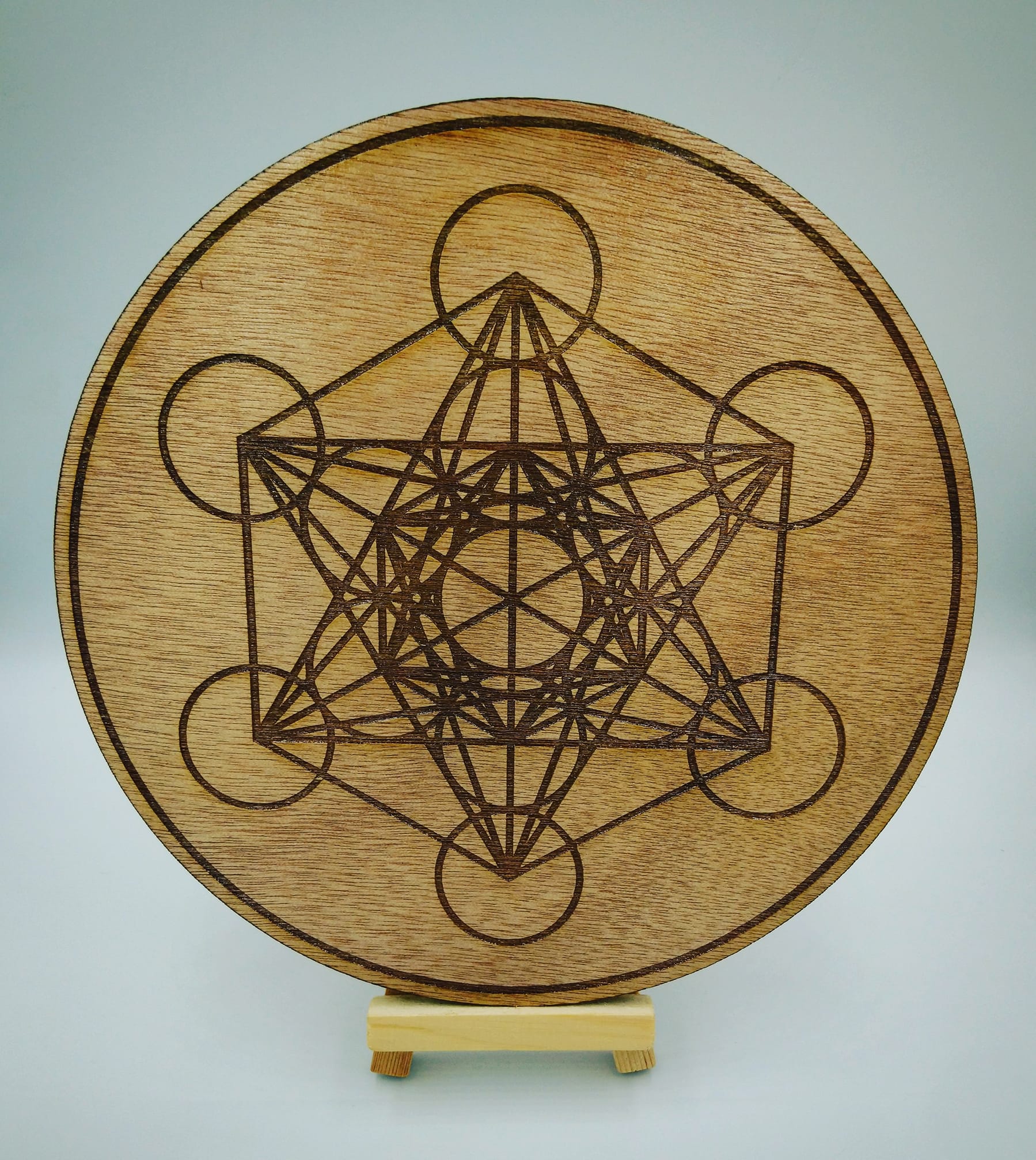 Support de bien-être en bois naturel avec le cube de Métatron gravé, vous pouvez le choisir en 9, 19, 29 ou 39 cm de diamètre.