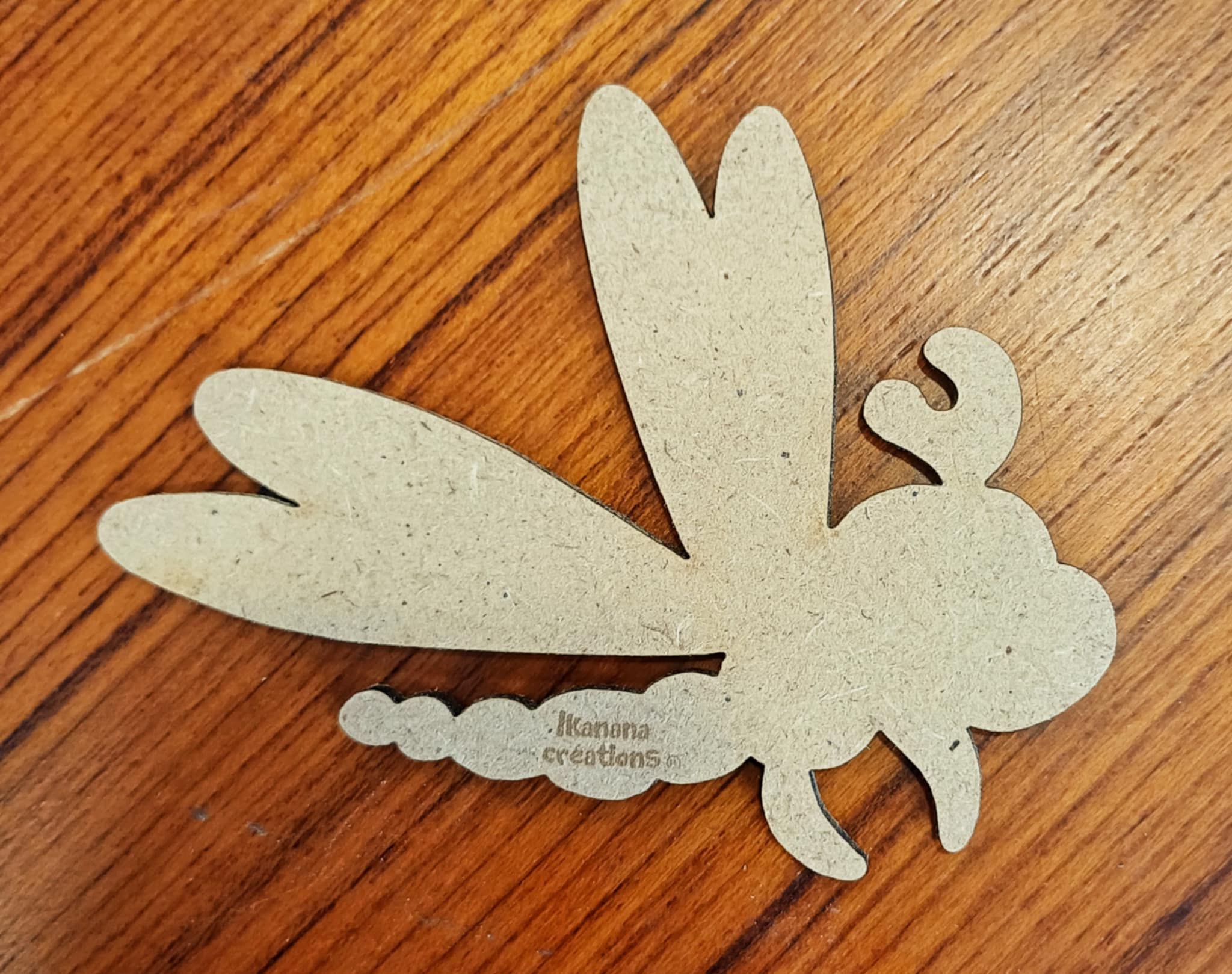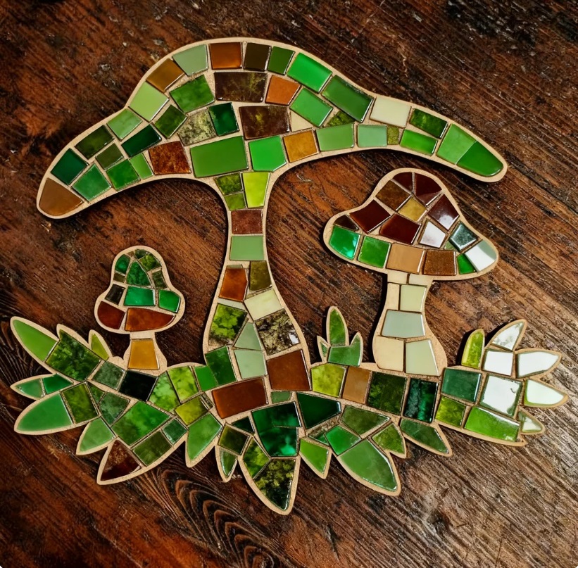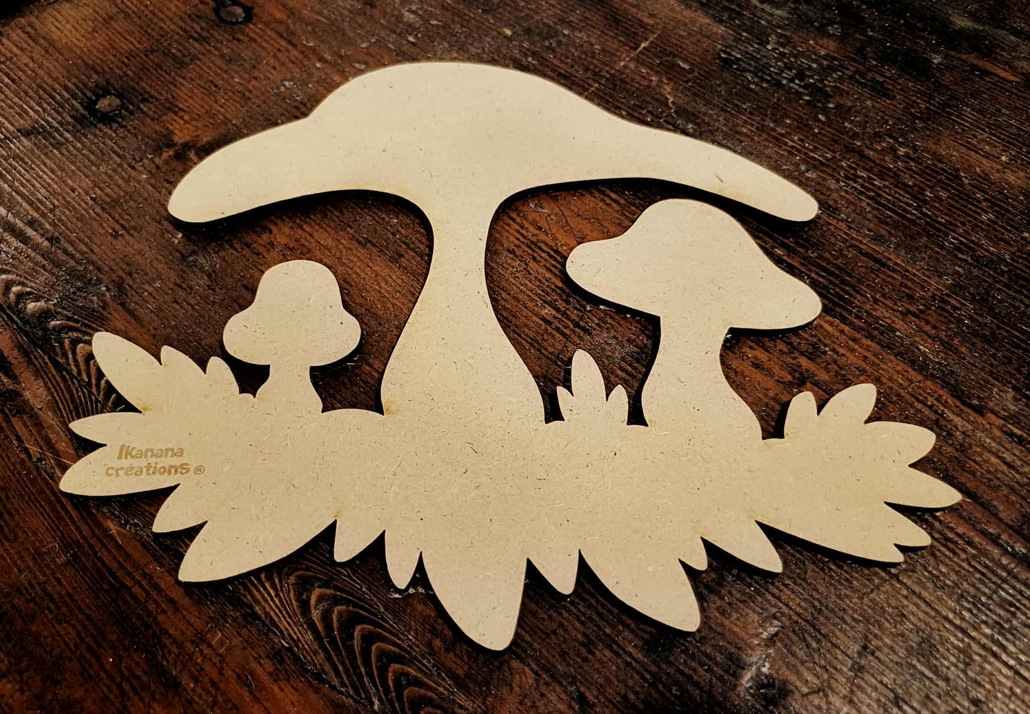 Support de loisirs créatifs avec la forme de 3 champignons sur un petit terrain en bois MDF.