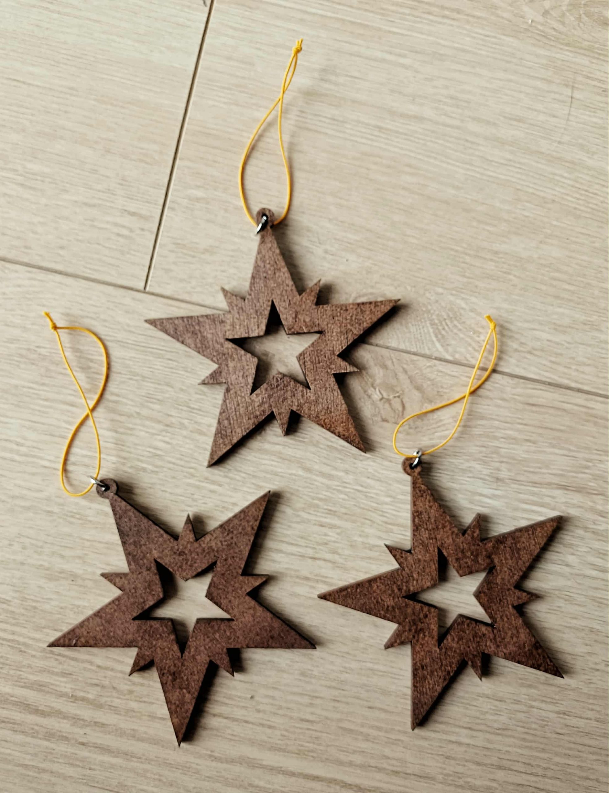 Suspension pour sapin de Noël en bois vernis avec la forme d’étoile.