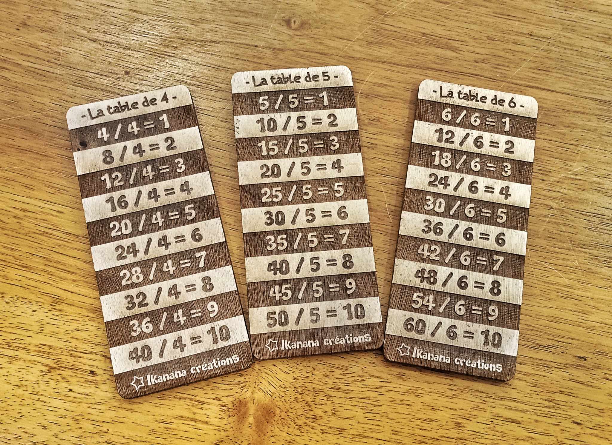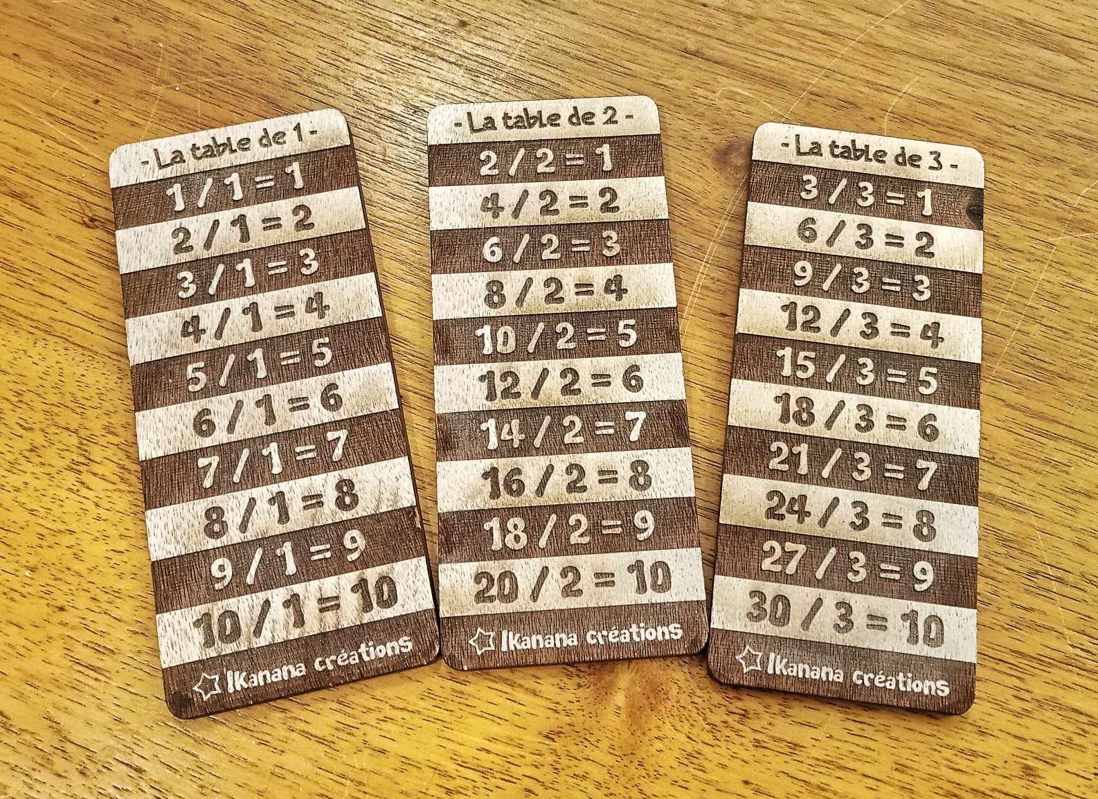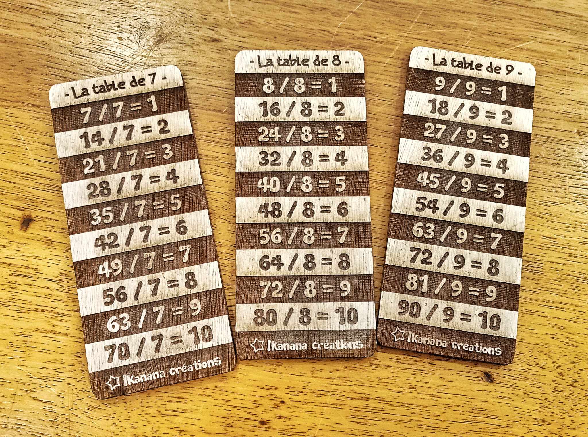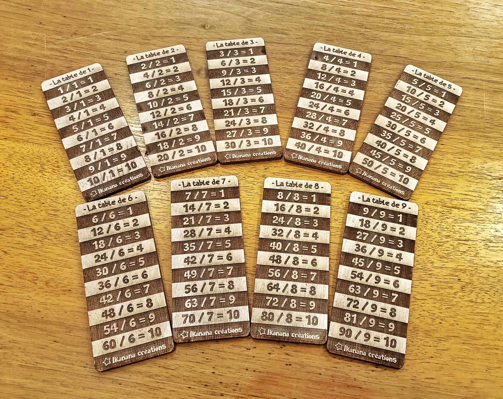 9 tables en bois traité pour aider aux enfants à apprendre les divisions de 1 jusqu’à 9.